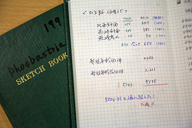研究室にてフィールドノートを広げ、調査結果を説明。