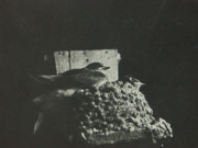 ヒナに足環をつけるため、黒い布を持って近づき、被せる。