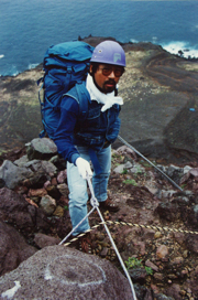鳥島のベースキャンプから繁殖コロニーへ向かうため約100mの崖を降りているところ。