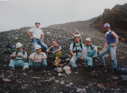 鳥島での調査に日本テレビが同行し、ヒナの巣立ちをカメラに収めた時の記念写真(1989年5月)。バブル期にはテレビ局の取材が多く、船のチャーター代を工面していただき大変助かった。
