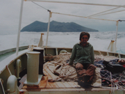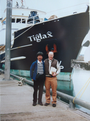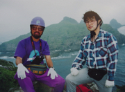 アホウドリの観察のためアラスカのアリューシャン列島を訪れた時、乗組員のキーヴィン・ベルさんと(1988年9月)。調査船Tiglax(アメリカの国鳥ハクトウワシを意味)に乗船して、ダッチハーバーからホーマーまで航海した。