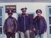 シベリアにて。通訳のアレクサンドル・ベリコフさん、カメラマンの長谷雄哲也さんとヘリコプター・パイロットの帽子とジャンパーを借りて記念写真。