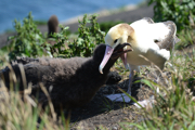 国際的な協力の下で保全活動が進められることとなった矢先の2002年8月11日、鳥島が63年ぶりに噴火しました。ニュースを聞いた瞬間、気が動転しました。鳥島全域が火山灰に覆われたら、アホウドリの保護活動が振り出しにもどってしまいます。幸運にも噴火の規模が小さく、アホウドリが鳥島を離れている非繁殖期だったこともあって直接の被害はなく、火山活動は終息に向かいました。噴火の3ヶ月後、「アホウドリ再生基本計画」について国際再生チームでの議論により、日本側は営巣地、アメリカ側は非繁殖期の採食海域での取り組みが主な役割分担となりました。また、火山ではない安全な島に繁殖地を形成する計画も盛り込まれました。候補地となったのが、小笠原諸島の聟島(むこじま)です。火山噴火のおそれや領土問題もなく、1930年代にはアホウドリが繁殖しており、再びアホウドリが飛来している様子も確認されていたのです。聟島では、アホウドリの繁殖ができるだけ早く始まるように、デコイと音声装置による誘引だけでなく、鳥島で生まれたヒナを運んで、調査員が巣立ちまで育てるという、より積極的な取り組みも決まりました。これは、若鳥が海上で数年間暮らした後、幼い頃に育った場所へ戻るという行動特性を生かした方法で、世界で初めての挑戦です。巣穴で繁殖する鳥の保護には使われていましたが、外で育つ鳥は生まれた場所を覚えるのが早いので難しいと考えられていました。ヒナがあまりに小さいと自分で体温調節することができないうえ、人間を間違って親と認識してしまう可能性もあるので、その限度である生後1ヶ月目の移動を決め、5年かけて計70羽のヒナをヘリコプターで運びました。中には生まれた鳥島に戻ってしまう個体もいましたが、一方で鳥島から聟島へと自発的に行く個体もいます。聟島から巣立った最初のヒナは聟島に運ばれた個体と、鳥島から自発的に行った個体がつがいになって生まれました。