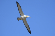 大空を滑るように飛ぶオキノタユウ。空気抵抗を減らすため、脚は腹部の羽毛の中に収納している。