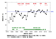 図2:調査開始からのアホウドリの繁殖成功率の推移。繁殖年度は産卵する秋からヒナが巣立つ翌年の初夏までをさし、ここでは卵が産まれた年を基準にしている。