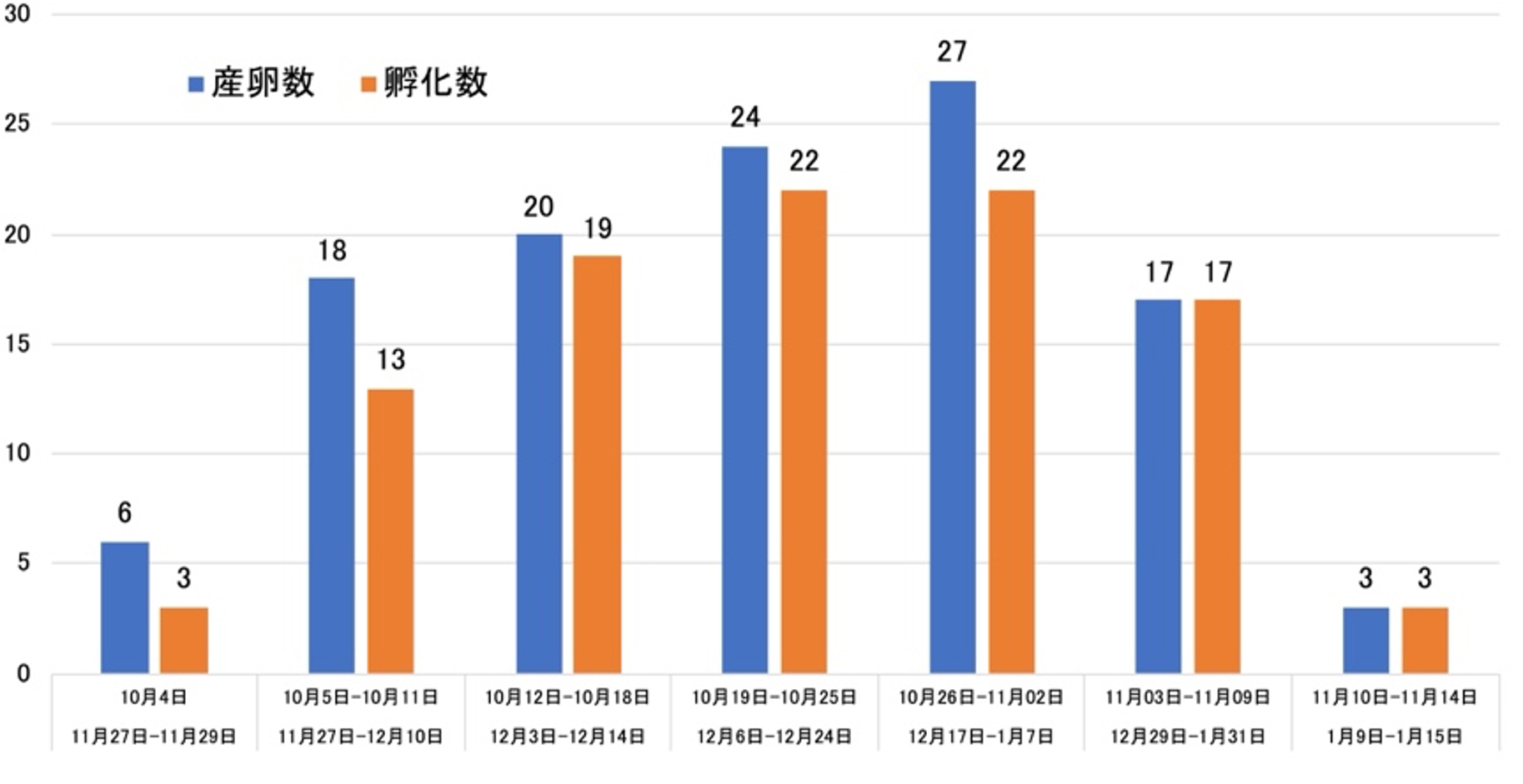 図2 ヤエヤマトガリナナフシの産卵数と卵の孵化率。日付については、上段は産卵期間、下段は孵化期間。