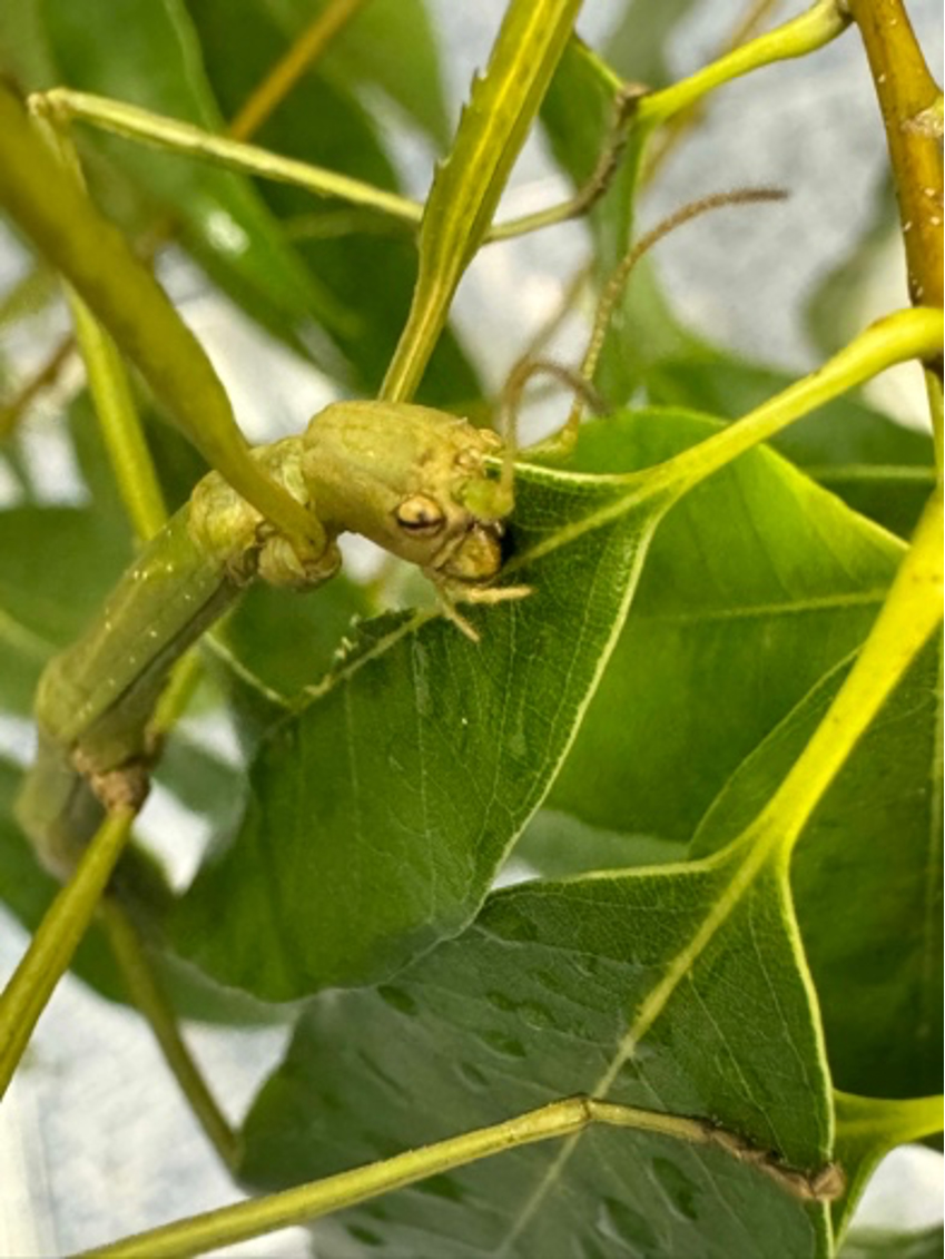 図1 ヤエヤマトガリナナフシがシラカシの葉っぱを食べている様子。