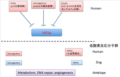 低酸素に対して鍵になる分子がHIFと呼ばれる転写因子で、α型とβ型が会合して酸素が低くなった時に必要な様々な遺伝子の転写を高める(例えば血流量を増やすための血管増殖因子遺伝子)。この分子の酸素濃度依存的調節だが、通常の酸素濃度では、酸素に反応するEGLN分子とVHLと言う分子がこのHIFα分子を常に壊し続けている。しかし酸素が低下すると、EGLN/VHLの作用が低下し、HIFαはHIFβと会合して低酸素反応性遺伝子の発現を誘導できるようになる。この他に、中ぐらいの反応を誘導する経路もあり、それにはHIF1ANと言う分子が関わっている。この経路は人だけでなく、ほとんどの動物で同じ分子が存在することから、高地順応は当然これらの分子に関係する分子の量や質を変化させることで進んで来たと予想できる。2010年Science誌7月号にアメリカユタ大学、及び中国北京ゲノム研究所からチベット族のゲノムを比べた論文が並んで発表された。(Simonson et al, Science 329,72, Yi et al, Science 329, 75)。ユタ大学の研究は主にマイクロアレーを使って調べる遺伝子多型、北京ゲノム研究所の論文はチベット人の転写されている遺伝子部分(エクソーム)の核酸配列、を比較して、高地順応に関わる遺伝子を探索した研究だ。全ゲノムレベルの多型解析から、高地順応と強く相関する遺伝子多型が10種類の遺伝子で認められたが、そのうちの3種類がHIF1αの活性抑制に関わる遺伝子だった。さらに残りの2種類はHIF1αによって誘導される遺伝子だ(図3)。