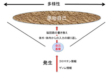 まず脳神経系の自己を発生させるためには、それを可能にする脳の構造・機能的基盤の発生が必要になる。この脳神経系の構築に関わる最も重要な情報がゲノムで、進化、あるいは種内の個体間の多様性として生まれるゲノム情報の違いは、脳神経系の構造や機能の違いに反映される。