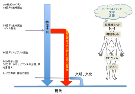 この様に進化研究を知るためには、他の動物とは際立って異なる人間の進化を抜きに終わることはできない。したがって「進化研究を覗く」も、図1に示した様に、この人間特有の進化の原動力となった身体から独立した情報、言語・文字・バーチャルメディアにいたるまで、その誕生と、生物進化へのインパクトについて考えるつもりにしている。しかし、ゲノム誕生、エピゲノム誕生、神経ネットワーク誕生と比べると、この作業はさらに困難であることは書いている私にもよくわかる。