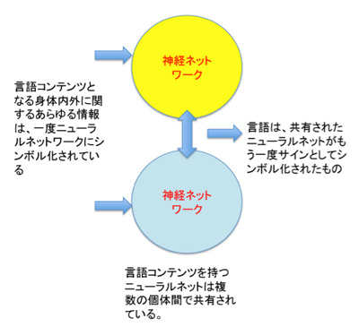 一方言語誕生は神経ネットワークの活動から生まれたもので、それに対応する物理学的過程自体も神経回路へとシンボル化しているため、物質的痕跡が全く存在しない。このことを図3に示した。繰り返すが、言語のコンテンツとなる様々な情報は、物理化学的に記述される現象に対応していても、言語として表現されるまでに、一度ニューラルネットに転換され表象されるため、シンボル化されている。この特定の内容が表象されたニューラルネットを複数の個体が共有することができると、今度はそれが再度シンボル化され、言語ができる。このように、シンボルの体系から新たなシンボルの体系が生まれることが言語の生物学的研究の最大の困難で、私自身も言語の起源について説得力のあるアイデアがあるわけではない。