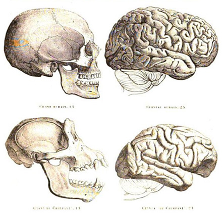 この3番目のプロセスを、Tomaselloのいう意図の共有と言っていいと思う。これが可能になるためにどのような脳回路の変化が起こる必要があったのかを明示するのは難しい。しかし、この回路の差が、その後の類人猿と、人類の脳構造の大きな差を生むことになる。図3に示すようにチンパンジーと人間の脳は、サイズ、特に前頭葉のサイズに大きな違いが見られるが、この進化の引き金も、意志の共有が可能になった結果なのかもしれない。事実、ロンドン大学のDunbarらは、類人猿や人類の前頭葉のサイズが、その種が生活している グループのサイズと比例することを示し、コミュニケーションの必要性が脳の発達を促した ことを示唆している(http://www.sciencedirect.com/science/article/pii/004724849290081J?via%3Dihub#!)