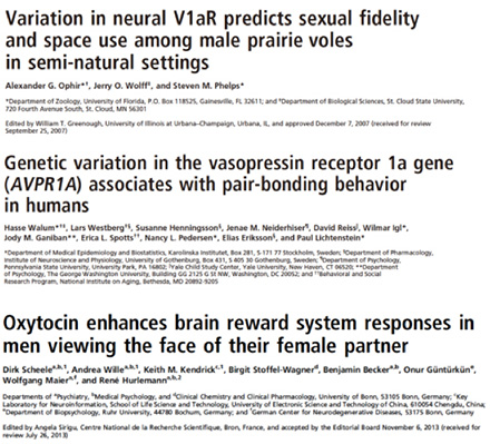 これでも十分面白いのだが、同じ年9月にスウェーデンカロリンスカ大学から、V1aRの遺伝子多型と男の浮気心についての研究が米国アカデミー紀要に発表された。この研究では、V1aRの一塩基多型(SNP)を調べ、特定のSNPを持っている男性は離婚を含む結婚の危機を経験している確率が、そのSNPを持たない男性と比べて2倍高いことを報告している。さらに、結婚ではなく同棲している率もこのSNPを持つ男性の方が2倍多い。この結果は、人間の夫婦形態が教育、文化等の影響を受けて複雑になってはいても、本能的なところでは、ハタネズミと同じ情動が働いていることを示唆している。