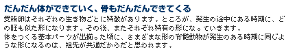 動物を、頭と胴体、四肢に分けて考えると、その成り立ちにはそれぞれのストーリーがある。ここでは、胴体を形作る背骨と肋骨に、その変化の現れを見てみよう。背骨は、よく似た小さな骨---椎骨がひとつながりに連なったものであり、一つ一つの椎骨に対して肋骨がある。